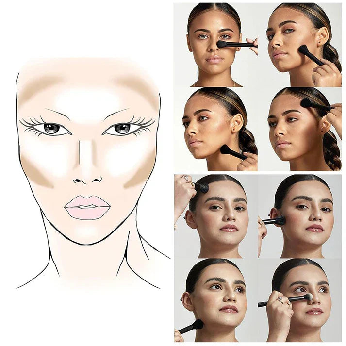 Use a contour brush to apply the deeper shades along the hollows of your cheeks, jawline, and temples for definition.